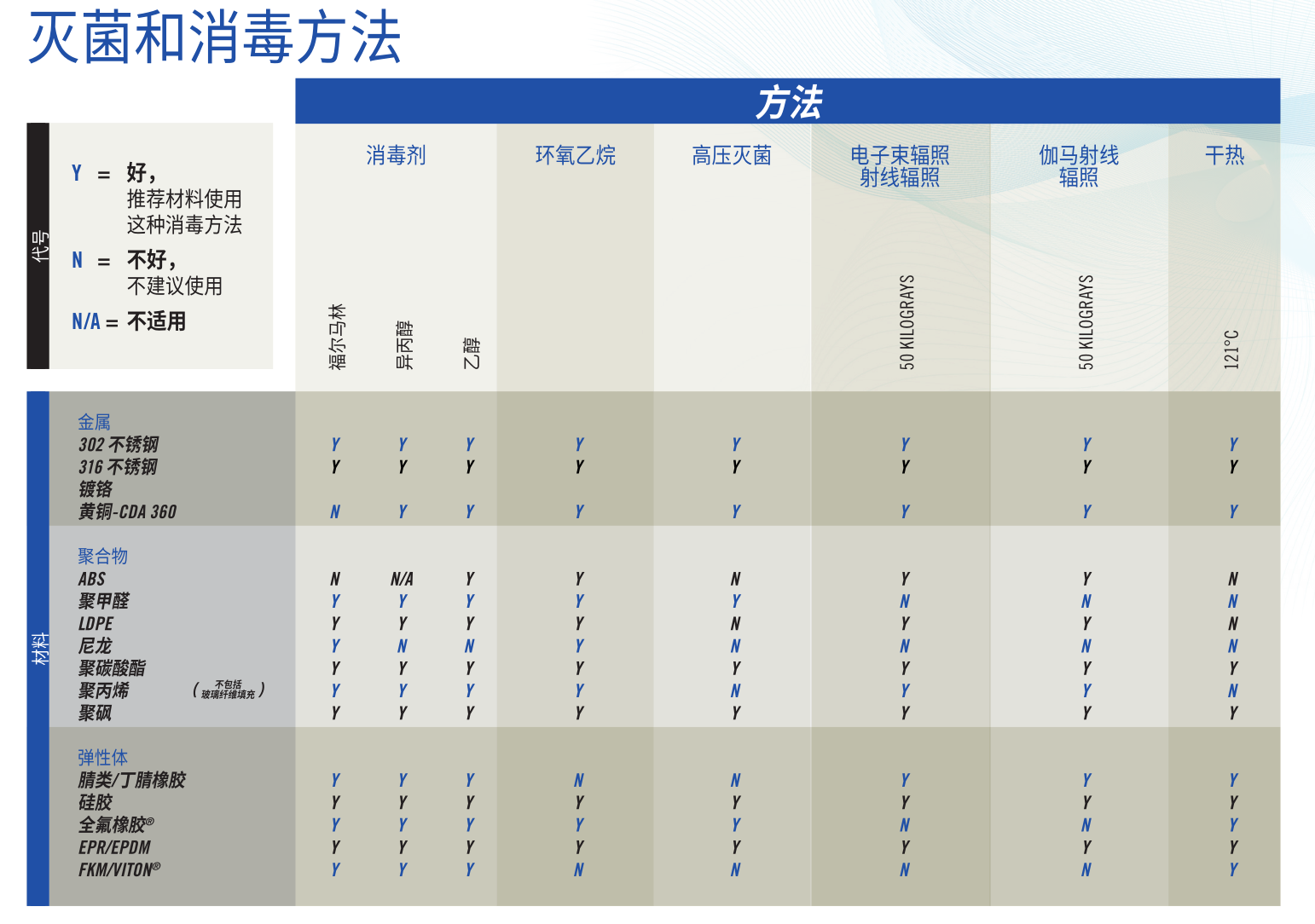 消毒劑: 20°C ,福爾馬林,乙醇等。連接或未連接滅菌。環氧乙烷, ETO : 100% EtO @ 43°C 消毒四小時,最多重復五次。連接或未連接時消毒。